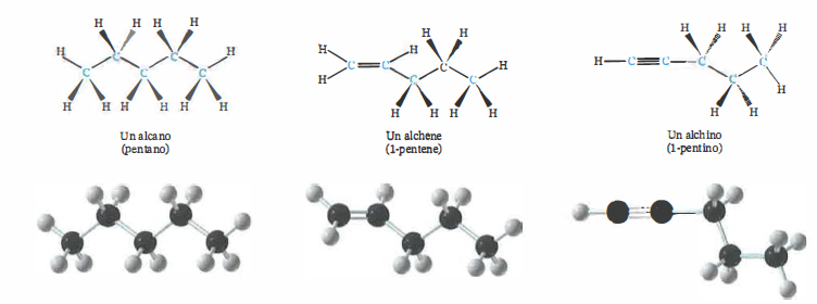 | Modelli molecolari di alcano, alchene e alchino. |
