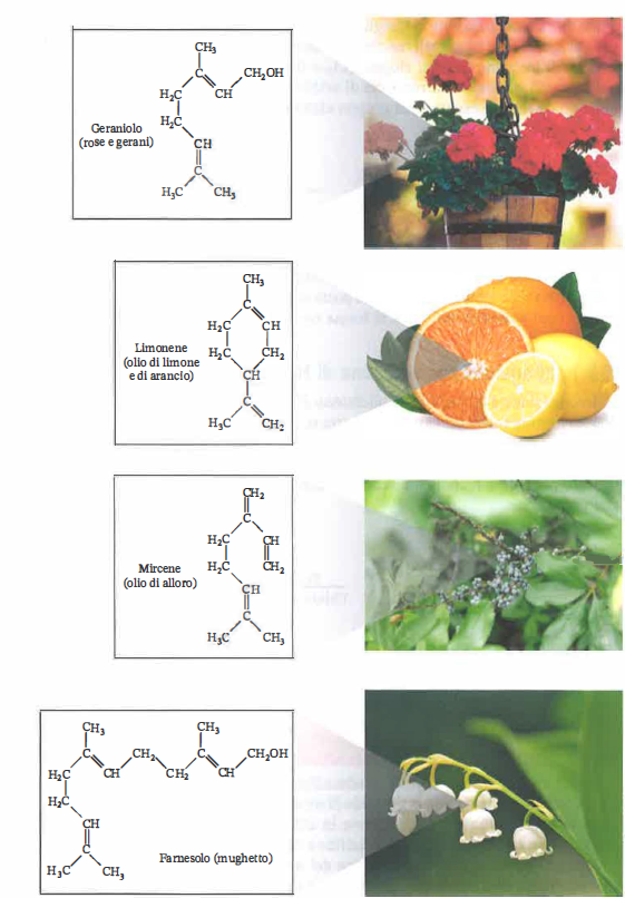 - monoterpeni (C10), formati da due unità isopreniche, spesso volatili e aromatici;