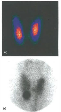 Lo studio della tiroide è tra le applicazioni storiche. La ghiandola utilizza iodio per sintetizzare ormoni tiroidei; in ipotiroidismo la captazione è ridotta, mentre in ipertiroidismo aumenta (Figura 07.28-02). A fini diagnostici si può somministrare una piccola attività di iodio radioattivo, per esempio pochi MBq di 123I o di 131I, in soluzione o capsula; dopo un intervallo prestabilito (ad esempio 24 ore per 131I) si misura l’emissione γ con un contatore o si acquisiscono immagini planari mediante gamma-camera. La misura può essere integrale (conteggi totali in un tempo definito) o spazialmente risolta, ottenendo una scintigrafia che rappresenta la distribuzione della captazione; esempi di scintigrafia ossea sono mostrati in (Figura 07.28-03). Per completezza, si ricorda la corrispondenza tra unità storiche e SI: 1 mCi = 37 MBq.