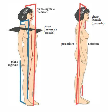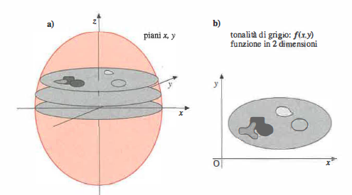 L’evoluzione dell’hardware di calcolo e delle interfacce ha reso possibile gestire grandi volumi di dati e flussi complessi, aprendo la strada a nuove metodiche d’imaging e a un’elaborazione avanzata delle immagini cliniche. Oltre a ecografia, microscopia digitale e digitalizzazione radiografica, un ruolo centrale è svolto dalle tecniche di tomografia, che ricostruiscono sezioni del corpo umano a partire da proiezioni acquisite da molteplici angolazioni. La ricostruzione tomografica mira a determinare la funzione f(x,y) che descrive le intensità (toni di grigio) in un piano specifico del soggetto (Figura 07.28-04). I piani di riferimento anatomici standard sono indicati in (Figura 07.28-05), con la possibilità di definire piani obliqui ove clinicamente necessario.