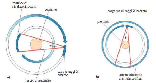Negli anni ’70, la maturazione congiunta di questi elementi rese possibile lo sviluppo progressivo delle diverse generazioni di TC. In configurazione classica, il tubo radiogeno percorre una traiettoria circolare e irradia il centro di rotazione; il paziente è allineato con l’asse di rotazione, mentre i rivelatori ruotano solidalmente al tubo o sono disposti in posizioni fisse attorno al gantry, come schematizzato in (Figura 07.28-07). L’introduzione di contatti rotanti a collettore (slip-ring) ha poi consentito la rotazione continua e, con lo scorrimento rettilineo del lettino durante l’acquisizione, ha dato origine alla TC elicoidale (o spirale), nella quale i piani tomografici si raccordano permettendo ricostruzioni volumetriche coerenti. In ambito di ricerca sono stati proposti anche assetti con più sorgenti distribuite su un arco o su una corona, attivate in sequenza per ridurre parti in movimento e abbreviare i tempi di acquisizione.