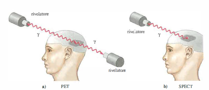 La tomografia a emissione di fotone singolo (SPECT) e la tomografia a emissione di positroni (PET) sono metodiche di Medicina Nucleare non invasive, impiegate tanto nella pratica clinica quanto nella ricerca in fisiologia, biochimica tissutale e farmacologia. Entrambe sfruttano radionuclidi somministrati come traccianti e rilevano, in vivo, la radiazione emessa dai decadimenti: nella SPECT si registrano fotoni γ singoli, nella PET si sfruttano coppie di fotoni da annichilazione. La ricostruzione delle immagini adotta schemi matematici analoghi a quelli della TC, basati su proiezioni a più angoli e sulla trasformata di Radon (Figura 07.28-12), tipicamente con filtraggi e algoritmi iterativi (ad esempio OSEM) per migliorare risoluzione e contrasto.
