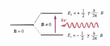 Dal punto di vista fisico, la RM è una spettroscopia in cui l’assorbimento e l’emissione di fotoni di energia \(h \nu\) avvengono tra livelli energetici quantizzati, separati dall’interazione tra momento magnetico nucleare e campo magnetico. Per i protoni (¹H), che dominano il segnale nei tessuti ricchi d’acqua, la frequenza di Larmor è \(\omega_0 = \gamma B_0\), con \(\gamma \approx 42{,}58\ \text{MHz/T}\); in campi clinici di 1,5–3,0 T corrispondono frequenze tipiche di 63,9–127,7 MHz, in accordo con l’intervallo 10 ÷ 100 MHz citato per sistemi a campi differenti. Il nucleo di idrogeno, dotato di spin e momento magnetico, in un campo B₀ si può trovare in due stati energetici (antiparallelo e parallelo a B₀), come schematizzato in (Figura 07.28-20).