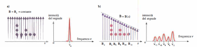 L’irraggiamento del campione alla frequenza di risonanza induce transizioni tra i due livelli; cessato l’impulso a radiofrequenza, il sistema ritorna allo stato di equilibrio rilasciando energia sotto forma di segnale RM. Il segnale captato da bobine a radiofrequenza è proporzionale alla densità di protoni e modulato dai tempi di rilassamento T₁ (spin‑reticolo) e T₂ (spin‑spin), i quali riflettono l’ambiente molecolare locale e forniscono il contrasto tissutale.