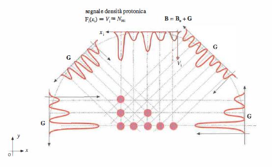 La codifica spaziale si ottiene applicando gradienti di campo magnetico, che rendono la frequenza di risonanza funzione della posizione. Variando nel tempo i gradienti lungo le tre direzioni (x, y, z), si selezionano fette e si attribuisce la codifica di fase e di frequenza ai segnali, discriminando i contributi dei diversi volumetti (Figura 07.28-21). L’insieme delle misure, interpretabile come una collezione di proiezioni della stessa grandezza fisica a più angoli e configurazioni (Figura 07.28-22), consente la ricostruzione della mappa di densità protonica e dei parametri di rilassamento. Poiché la sensibilità è principalmente verso i protoni, le immagini RM riflettono in larga misura la distribuzione dell’idrogeno, abbondante nelle molecole d’acqua e nei lipidi.