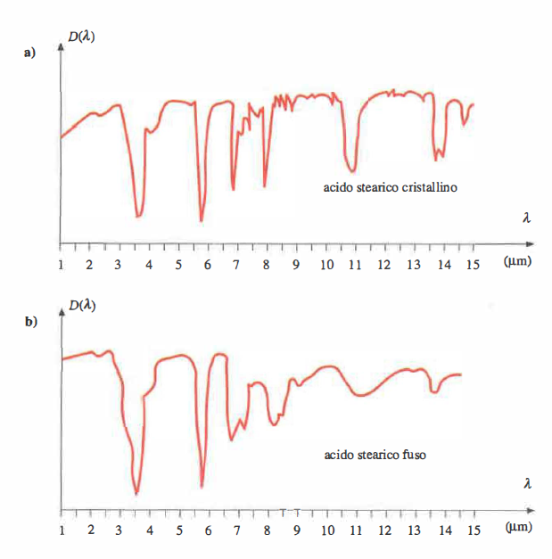 Atomi, molecole, complessi o ioni presenti nella cuvetta assorbono in intervalli specifici di \(\lambda\); la forma e la posizione delle bande permettono l’identificazione. La (Figura 07.43-02) riporta lo spettro di assorbimento dell’acido stearico: lo stato fisico (solido o liquido) modula profilo e ampiezza delle bande, ma gli elementi caratteristici rimangono riconoscibili.