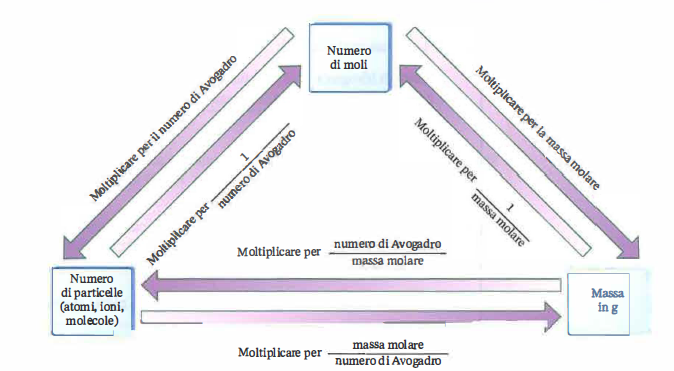 La conversione bidirezionale tra le tre grandezze — massa in grammi, quantità di sostanza in moli, numero di particelle — è riassunta nello schema della (Figura 04.01-02).