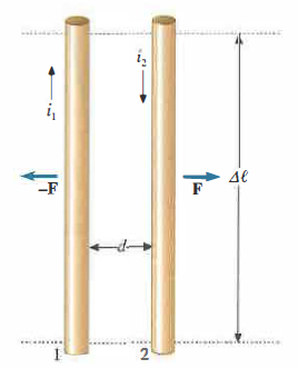 \[ F \;=\; \frac{\mu}{2\pi}\,\frac{i_1\,i_2\,\Delta \ell}{d}\,. \]