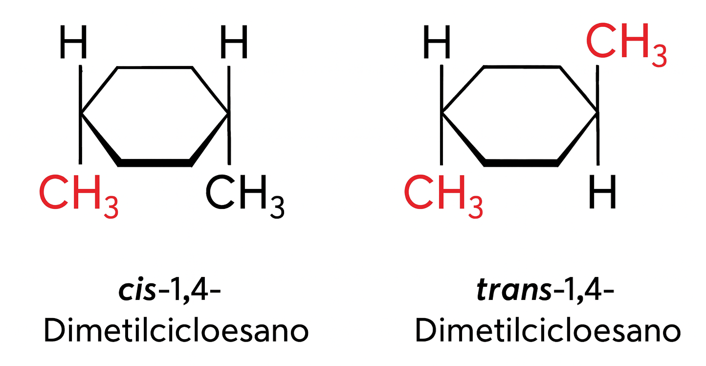 Per chiarezza, si consideri un esempio distinto: nel 1,3-dimetilciclopentano, la forma cis presenta entrambi i metili dallo stesso lato del piano dell’anello, mentre nella forma trans i metili sono su lati opposti. Queste due specie hanno proprietà fisiche differenziate (per esempio, solubilità e punto di ebollizione) e possono essere separate con comuni tecniche di laboratorio. Analogamente, nel 1,2-dibromocicloesano le configurazioni cis e trans sono diastereomeri tra loro e non interconvertibili senza scissione del ciclo.