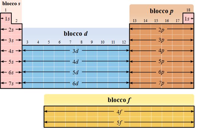 La tavola periodica mostra quattro regioni distinte che corrispondono al tipo di sottolivello che viene riempito con gli elettroni.