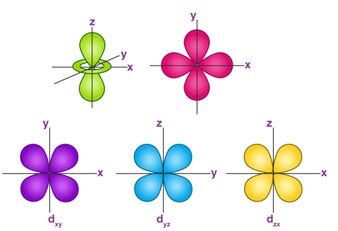In ciascun livello \(n\) esiste un solo orbitale s (1s, 2s, 3s, …). Per i sottolivelli p, la (Figura 01.10-02) mostra i tre orbitali degeneri, identici per energia ma orientati diversamente nello spazio. Essi sono etichettati come \(p_x\), \(p_y\), \(p_z\) e i loro lobi si dispongono lungo gli assi cartesiani. La (Figura 01.10-03) rappresenta i cinque orbitali d degeneri: le loro forme, caratterizzate da nodi angolari più numerosi, risultano cruciali per le proprietà dei metalli di transizione e per la chimica di coordinazione. Esistono inoltre orbitali di ordine superiore (f, g, …), rilevanti soprattutto negli elementi delle ultime righe della tavola periodica.