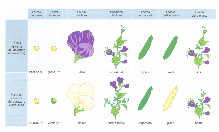 Un ulteriore vantaggio era la disponibilità di molte varietà, ciascuna con tratti discreti e facilmente riconoscibili: ad esempio fiori di colore viola o bianco, o semi con tegumento liscio oppure rugoso. Mendel selezionò sette caratteri, ciascuno espresso in due forme alternative ben distinte e poco influenzate da variabili ambientali: la netta distinguibilità dei fenotipi era cruciale per una valutazione non ambigua degli esiti (Figura 07.13-03):