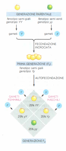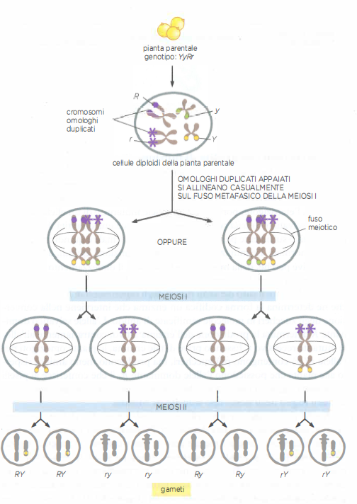 Se consideriamo i caratteri classici del pisello, ogni ovocellula e ogni granulo pollinico riceve, in modo mutuamente esclusivo, un allele per il colore del seme (ad esempio giallo oppure verde), uno per la forma (liscio oppure rugoso), uno per il colore del fiore (viola oppure bianco) e così via. La fecondazione, cioè l’unione casuale di un gamete maschile con uno femminile, ripristina nello zigote la coppia di alleli per ciascun carattere. La casualità dell’incontro tra gameti fa sì che la ricomposizione delle coppie alleliche nello zigote sia governata da regole probabilistiche ben definite.