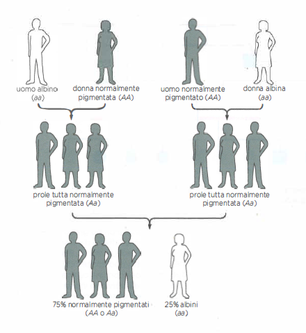 Per illustrare un tratto umano monogenico a eredità autosomica recessiva, consideriamo l’albinismo oculocutaneo: varianti loss-of-function in geni della via biosintetica della melanina conducono a ridotta o assente pigmentazione di cute, capelli e occhi. Gli individui affetti sono omozigoti per l’allele recessivo, indicato con a, e hanno genotipo aa; i portatori eterozigoti (Aa) sono in genere fenotipicamente normali poiché l’allele A è sufficiente a garantire un livello funzionale di pigmentazione (Figura 07.13-08).