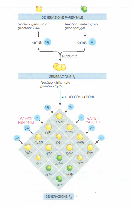 - Incrocio diibrido tra linee pure (YYRR × yyrr) produce F1 uniformi (YyRr) con fenotipi dominanti;
