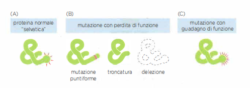 Le mutazioni sono alterazioni ereditabili della sequenza del DNA generate da errori di replicazione, agenti mutageni o processi endogeni. Dal punto di vista funzionale, esse si classificano in base all’impatto sull’attività genica. Le mutazioni con perdita di funzione riducono o aboliscono l’azione del gene o del suo prodotto (Figura 07.13-13). Un individuo omozigote per un allele con perdita di funzione manifesta spesso un fenotipo deviante rispetto al tipo più comune, sebbene in alcuni casi le differenze siano sottili. L’eterozigote che conserva un allele di tipo selvatico, nella maggior parte dei casi, produce quantitativi sufficienti di prodotto attivo per sostenere una funzione normale; per questo motivo molte mutazioni con perdita di funzione risultano recessive.