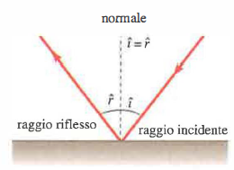 Per la riflessione, le leggi risultanti affermano che il raggio incidente, il raggio riflesso e la normale alla superficie nel punto d’impatto giacciono su uno stesso piano. Inoltre, l’angolo di riflessione \(r\) è uguale all’angolo di incidenza \(i\) (Figura 04.12-01). Questa simmetria angolare è indipendente dalla natura dell’onda (meccanica o elettromagnetica) ed è una conseguenza della reversibilità geometrica del percorso ottico.