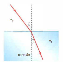 - Se \(v_{2} < v_{1}\) (equivalentemente \(n_{2} > n_{1}\)), il raggio rifratto si avvicina alla normale;