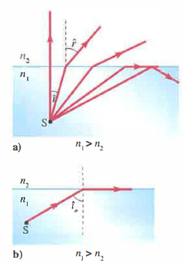 \[ \frac{\text{sen} \, \hat{i}_o}{\text{sen} \, 90^\circ} = n_{12}, \quad \text{da cui} \quad \text{sen} \, \hat{i}_o = \frac{n_2}{n_1} \quad (n_1 > n_2). \]