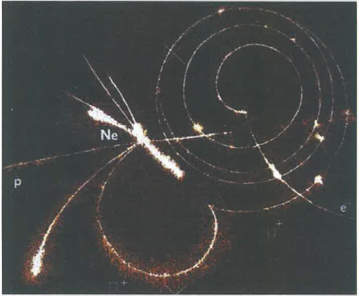 Fotografia del moto di particelle cariche in un campo magnetico ortogonale alla loro traiettoria: la perdita di energia per emissione di onde elettromagnetiche (invisibili nella fotografia) causa una continua diminuzione del raggio delle traiettorie. Un antiprotone (protone negativo) arriva da sinistra e colpisce un nucleo di neon sfasciandolo. Ne escono varie particelle cariche (quelle neutre come i neutroni non sono rivelabili con il particolare rivelatore – camera a streamer) che vengono deviate dal campo magnetico ortogonale all’immagine secondo la relazione (17.8). Poiché le tracce visibili sono costituite da ioni, formati nel materiale del rivelatore (gas) dal passaggio delle particelle cariche prodotte nelle collisioni con atomi di gas, quelle più grosse (e che deviano meno) sono nuclei leggeri (elio, litio). La traccia verso il basso a sinistra è dovuta a un protone che si ferma nel rivelatore: l’aumento di ionizzazione corrisponde al picco di Bragg mostrato in Figura 22.4. La traccia in basso di maggiore curvatura è di un mesone π⁺ che decade in un mesone μ⁺ e in neutrini (invisibili) nel vertice a V capovolta. Il mesone μ⁺ (di massa minore del mesone π⁺) esegue una traiettoria elicoidale perdendo energia elettromagnetica, diminuendo la sua energia cinetica e quindi il raggio della traiettoria fino al punto in cui, dopo una vita media caratteristica, a sua volta decade in un elettrone positivo e⁺ (molto più leggero) e in neutrini (non rivelati), dando luogo alla traccia che esce dal fotogramma a destra.