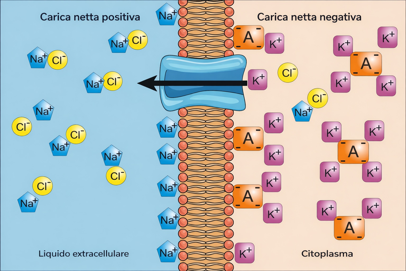 Nelle cellule animali, il Na⁺ è tipicamente più concentrato all’esterno, mentre il K⁺ predomina nel citosol (Tabella 05.04-01). Il mantenimento dell’elettroneutralità richiede che, in ogni compartimento, le cariche positive siano bilanciate da cariche negative. Così, l’elevato Na⁺ extracellulare è controbilanciato principalmente dal Cl⁻, mentre l’abbondanza intracellulare di K⁺ è accompagnata da anioni organici e inorganici, inclusi proteine, acidi nucleici e metaboliti fosforilati. La pompa Na⁺/K⁺-ATPasi, unitamente ad altri sistemi di trasporto, contribuisce in modo determinante a queste distribuzioni ioniche.