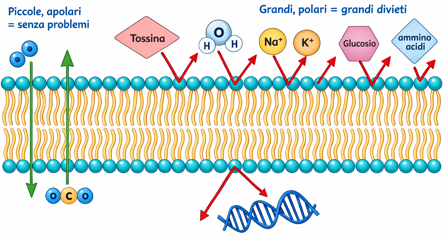 - Piccole molecole apolari, come l’ossigeno (O₂, 32 Da) e l’anidride carbonica (CO₂, 44 Da), si dissolvono agevolmente nella fase idrocarburica e la attraversano in tempi brevi per diffusione; questa permeabilità ai gas è cruciale per gli scambi respiratori;