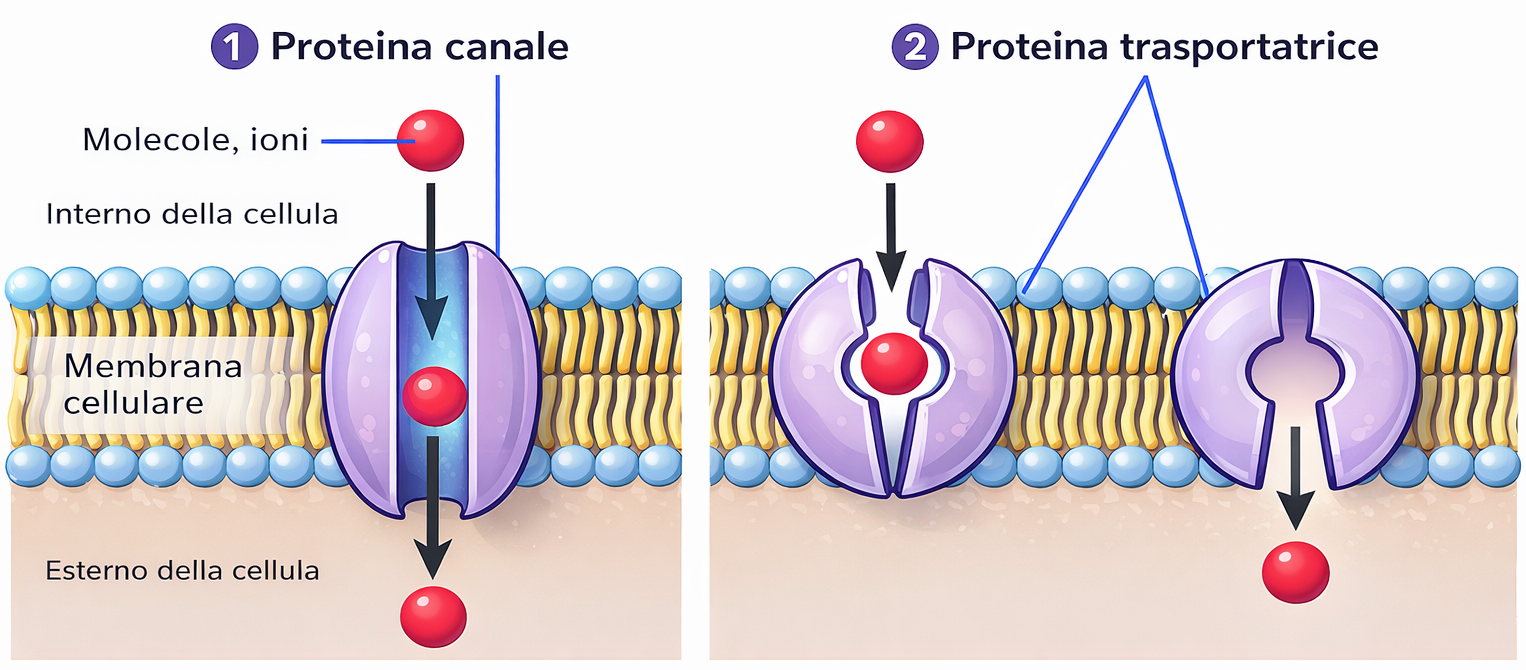 Per gran parte di queste specie, l’attraversamento per diffusione semplice è troppo lento per sostenere le esigenze fisiologiche; il flusso viene quindi accelerato da proteine di membrana specializzate, dando luogo al trasporto facilitato. In termini generali, due grandi classi di proteine mediano tale movimento: i canali, che forniscono percorsi idrofili attraverso la membrana, e i trasportatori (o carrier), che si legano selettivamente i soluti e ne catalizzano il trasferimento attraverso la barriera lipidica. A queste si affiancano pompe dipendenti da energia metabolica, che spostano attivamente soluti contro i relativi gradienti. I principi fisico-chimici che regolano la permeabilità e le differenze di concentrazione, soprattutto per gli ioni inorganici, sono alla base di processi cellulari essenziali.