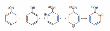 Dal punto di vista strutturale, le coppie elettroniche sull’ossigeno sono allineate con il sistema \( \pi \) dell’anello, consentendo un accoppiamento \( p\)-\( \pi \) efficace. Le forme di risonanza con separazione di carica, pur contribuendo in misura non dominante all’ibrido reale, aumentano la densità elettronica sull’anello e lasciano una parziale carica positiva su ossigeno. Ne risulta un incremento della polarizzazione del legame O–H e una più agevole dissociazione in \( \mathrm{H^+} \) e fenossido, spiegando perché i fenoli siano più acidi rispetto agli alcoli alifatici privi di tale delocalizzazione.