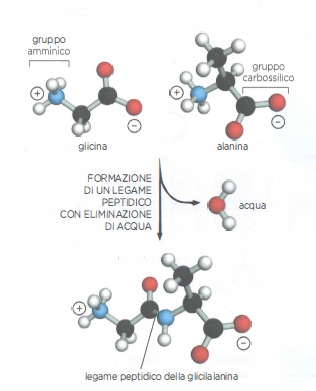 Gli amminoacidi sono legati tra loro con un legame peptidico. Il legame covalente peptidico si forma quando l’atomo di carbonio situato nel gruppo carbossilico di un amminoacido (per esempio la glicina) condivide gli elettroni con l’atomo di azoto appartenente al gruppo amminico di un altro amminoacido (per esempio l’alanina). Dal momento che una molecola di H₂O viene eliminata, la formazione del legame peptidico è classificata come reazione di condensazione. In questo schema gli atomi di carbonio sono neri, quelli di azoto blu, quelli di ossigeno rossi e quelli di idrogeno bianchi.