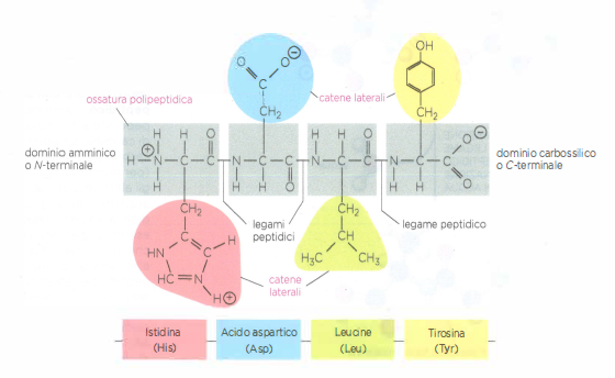 Una proteina è composta da amminoacidi uniti tra loro in una catena polipeptidica. Gli amminoacidi sono uniti tramite legami peptidici formando l’ossatura polipeptidica di una struttura ripetuta da cui si proiettano le catene laterali. La disposizione in sequenza di queste catene laterali, che hanno caratteristiche chimiche differenti e possono essere non polari (verde), polari senza carica (giallo), laterali positive (rosso) o laterali negative (azzurro), conferisce a ogni proteina le sue proprietà peculiari. Qui è raffigurato un piccolo polipeptide di quattro amminoacidi soltanto. Le proteine di solito sono catene di parecchie centinaia di amminoacidi, la cui sequenza viene sempre scritta a partire dall’N-terminale e letta da sinistra verso destra.