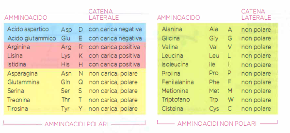 Nelle proteine generalmente si trovano venti amminoacidi diversi. Sono riportate le abbreviazioni dei loro nomi a tre o a una lettera, oltre alle caratteristiche della catena laterale. Le catene laterali polari (idrofile) e quelle non polari (idrofobe) sono in ugual numero e metà delle catene laterali polari contiene carica positiva o negativa a pH neutro in soluzione acquosa.