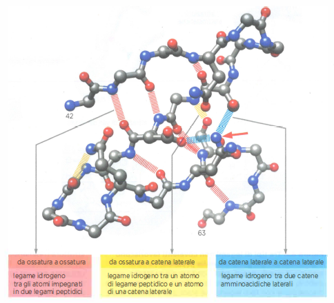 I legami idrogeno all’interno della molecola proteica contribuiscono a stabilizzarne la conformazione ripiegata. Quando una catena polipeptidica si ripiega su se stessa, i tratti che vengono a trovarsi vicini stabiliscono numerosi legami idrogeno. La struttura qui rappresentata è una parte dell’enzima lisozima, tra gli amminoacidi 42 e 63. I legami idrogeno che interessano atomi dell’ossatura sono indicati in rosso, quelli che coinvolgono atomi del legame peptidico e di catene laterali in giallo e quelli tra atomi di catene laterali in blu. Si noti che la stessa catena amminoacidica laterale può formare diversi legami idrogeno (freccia rossa). In questo diagramma gli atomi di azoto sono in blu, gli atomi di ossigeno in rosso e gli atomi di carbonio in grigio; gli atomi di idrogeno non sono mostrati.