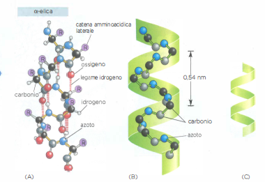 Alcune catene polipeptidiche si ripiegano in una disposizione regolare e ripetitiva nota come α-elica. (A) In un’α-elica l’N-H di ogni legame peptidico stabilisce un legame idrogeno con il C=O di un legame peptidico adiacente, situato quattro legami peptidici più a valle nella catena. Sono mostrati tutti gli atomi dell’ossatura polipeptidica; le catene amminoacidiche laterali sono indicate con la lettera R. (B) Stesso polipeptide di cui sono rappresentati solo gli atomi di carbonio (nero e grigio) e azoto (blu). (C) Rappresentazione schematica di un’α-elica che si usa nei modelli a nastro delle proteine.