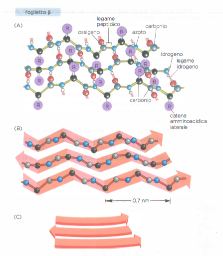 Alcune catene polipeptidiche si ripiegano in una disposizione regolare nota come foglietto β. (A) In un foglietto β molti segmenti di un’unica catena polipeptidica sono tenuti insieme da legami idrogeno che si stabiliscono tra legami peptidici dei vari tratti: in ogni tratto le catene laterali amminoacidiche si proiettano verso l’alto o verso il basso rispetto al piano definito dal foglietto. Nell’esempio mostrato qui le catene adiacenti decorrono in direzioni opposte, formando un foglietto β antiparallelo. Sono indicati tutti gli atomi dell’ossatura polipeptidica: le catene laterali sono simboleggiate da una R. (B) Stesso polipeptide di cui sono rappresentati solo gli atomi di carbonio (nero e grigio) e azoto (blu). (C) Rappresentazione schematica del foglietto β che si usa nei modelli a nastro delle proteine (Figura 4.11B).