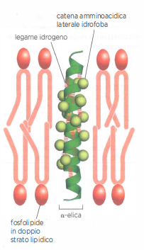 Molte proteine legate alla membrana attraversano il doppio strato lipidico sotto forma di α-elica. Il lato idrofobo delle catene amminoacidiche che formano l’α-elica entra in contatto con le code idrofobe delle molecole fosfolipidiche, mentre le parti idrofile dell’ossatura polipeptidica formano tra loro legami idrogeno all’interno dell’elica. Per attraversare lo spessore di una membrana ci vogliono circa 20 amminoacidi disposti ad α-elica. Si noti che, sebbene in questo disegno schematico sia visibile uno spazio al suo interno, l’elica non è un canale: nessuno ione o piccola molecola può attraversarla.