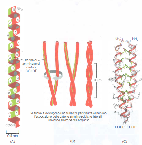 Più α-eliche avvolte su se stesse possono formare un’elica superavvolta. (A) È rappresentata una singola α-elica in cui le catene amminoacidiche laterali sono marcate a gruppi ripetitivi di sette con le lettere “a b c d e f g”. In una disposizione di questo tipo gli amminoacidi “a” e “d” vengono a trovarsi molto vicini tra loro in corrispondenza della superficie del cilindro e formano una specie di banda (evidenziata in verde) che si avvita lentamente lungo l’α-elica. Di regola, le proteine che formano eliche superavvolte presentano amminoacidi non polari nelle posizioni “a” e “d”: quindi, come si vede in (B), le due α-eliche possono avvolgersi l’una sull’altra in maniera che le catene laterali non polari di un’elica interagiscano con quelle dello stesso tipo sull’altra, lasciando le catene laterali idrofile (evidenziate in rosso) esposte all’ambiente acquoso. (C) Un tratto della struttura atomica di un’elica superavvolta formata da due α-eliche, determinata con la cristallografia a raggi X. In questa struttura gli atomi che formano l’ossatura delle eliche sono evidenziati in rosso; le catene laterali non polari che interagiscono sono in verde, mentre le altre catene laterali sono in grigio. Le eliche superavvolte possono essere formate anche da tre α-eliche.