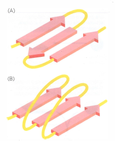 I foglietti β possono avere due tipi di andamento. (A) Foglietto β antiparallelo (Figura 4.13A). (B) Foglietto β parallelo. Entrambe queste strutture ricorrono di frequente nelle proteine. Per convenzione la freccia punta verso il C-terminale della catena polipeptidica.