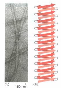 I foglietti β possono impilarsi per formare una fibra amiloide. (A) In questa fotografia al microscopio elettronico viene mostrata una fibra amiloide del lievito. Questa struttura ricorda il tipo di aggregati insolubili che si osservano nei neuroni di soggetti affetti da varie patologie neurodegenerative (Figura 4.19). (B) In questa rappresentazione schematica viene mostrata l’aggregazione dei foglietti β che stabilizza una fibra amiloide.