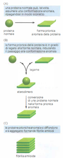 Le malattie da prioni sono causate da proteine la cui conformazione anomala è infettiva. (A) La proteina subisce un raro cambiamento conformazionale, ripiegandosi in modo anomalo nella forma prionica. (B) Nell’encefalo ospite la proteina anomala induce la conversione di proteine normali nella forma anomala. (C) I prioni si aggregano e formano fibrille amiloidi, che compromettono la funzione cerebrale causando patologie neurodegenerative (Figura 4.18). Alcune di queste fibrille amiloidi anomale che si formano nei principali disturbi neurodegenerativi, come la malattia di Alzheimer, si possono propagare da una cellula all’altra in questo modo.