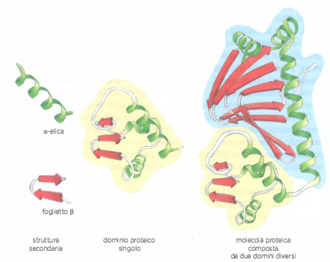 Molte proteine sono composte da domini funzionali distinti. Elementi di struttura secondaria come le α-eliche e i foglietti β si compattano in elementi globulari stabili e indipendenti, detti domini proteici. Una tipica molecola proteica consta generalmente di uno o più domini, collegati da tratti di catena polipeptidica spesso relativamente poco strutturati. Il modello a nastro a destra rappresenta la proteina batterica CAP, regolatrice della trascrizione, composta da un grande dominio di legame con l’AMP ciclico (fondino blu) e da un piccolo dominio di legame con il DNA (fondino giallo).