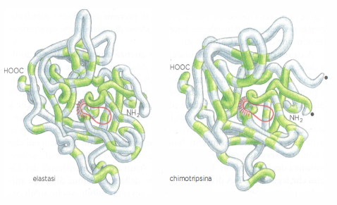 Le serina proteasi costituiscono una famiglia di enzimi proteolitici. Il disegno illustra la conformazione di ossatura di due serina proteasi: l’elastasi e la chimotripsina. Anche se nella catena polipeptidica delle due proteine coincidono solo gli amminoacidi evidenziati in verde, le due conformazioni sono molto simili quasi ovunque. Ciononostante, le due proteasi prediligono substrati differenti. Il sito attivo di ciascun enzima, dove si legano e vengono scissi i substrati, è cerchiato in rosso. L’amminoacido serina partecipa direttamente al processo di scissione, motivo per cui gli enzimi si chiamano serina proteasi. I due pallini neri sul lato destro della molecola di chimotripsina indicano le due estremità generate dove l’enzima ha scisso la sua ossatura.