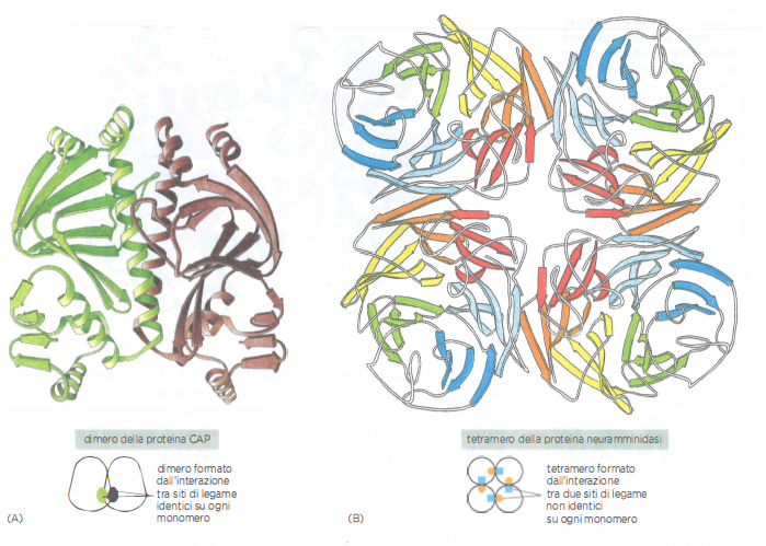 Molte molecole proteiche contengono copie multiple della stessa subunità polipeptidica. (A) Dimero simmetrico. La proteina CAP è un complesso di due catene polipeptidiche identiche (Figura 4.20). (B) Tetramero simmetrico. L’enzima neuramminidasi è composto da quattro catene polipeptidiche uguali disposte ad anello. Sia per (A) sia per (B) il piccolo disegno schematico riportato sotto i modelli a nastro mette in evidenza come la struttura sia tenuta insieme da interazioni di legame identiche. In (A) l’uso dello stesso sito di legame su ogni monomero (l’ovale verde o marrone nel disegno schematico) porta alla formazione di un dimero simmetrico. In (B) una coppia di siti di legame diversi (rappresentati da cerchietti arancioni e quadrati blu) porta alla formazione di un tetramero simmetrico.