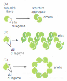 Subunità proteiche identiche possono aggregarsi in strutture complesse. (A) Una proteina dotata di un solo sito di legame può formare un dimero con un’altra proteina identica. (B) Proteine identiche con due siti di legame diversi formano spesso un lungo filamento elicoidale. (C) Se i due siti di legame sono disposti in modo opportuno uno rispetto all’altro, le subunità proteiche formeranno un anello chiuso anziché un’elica (Figura 4.23B).