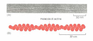 Un filamento di actina è composto da subunità proteiche identiche. (A) Fotografia al microscopio elettronico a trasmissione di un filamento di actina. (B) La serie di molecole di actina con andamento elicoidale in un filamento contiene spesso migliaia di molecole e può raggiungere lunghezze di micrometri dentro la cellula. 1 micrometro = 1000 nanometri.