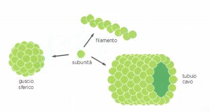 Subunità proteiche di un solo tipo possono compattarsi formando filamenti, tubuli cavi e gusci sferici. Le subunità di actina, per esempio, formano filamenti di actina (Figura 4.26); le subunità di tubulina formano microtubuli cavi, mentre alcune proteine dei virus formano un guscio sferico (capside) che racchiude il genoma virale (Figura 4.28).