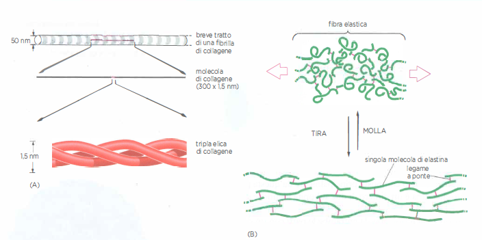 Il collagene e l’elastina formano strutture molto diverse. (A) Il collagene è una tripla elica formata da tre catene proteiche allungate che si avvolgono una sull’altra. Negli spazi extracellulari le molecole affusolate del collagene si legano tra loro in gran numero e formano fibrille inestensibili (in alto) che hanno una resistenza alla trazione pari a quella dell’acciaio. Le striature derivano dalla disposizione regolare e ripetitiva delle molecole di collagene nella fibrilla. (B) Le molecole di elastina sono legate le une alle altre da legami covalenti (in rosso) che formano fibre elastiche di consistenza gommosa. Ogni catena polipeptidica di elastina si allunga in una conformazione ancora più distesa quando la fibra viene tirata e si riavvolge spontaneamente appena cessa la trazione.