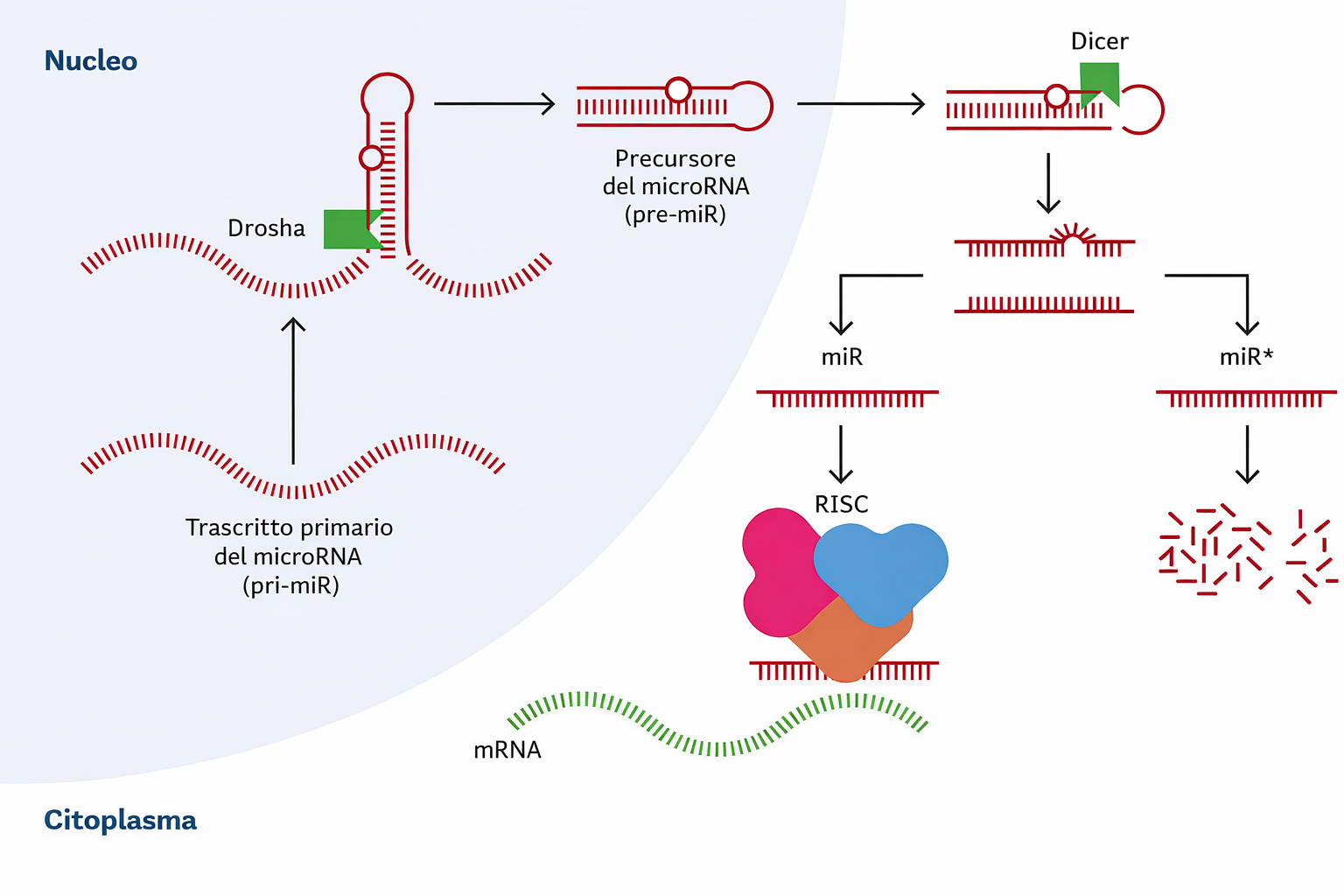 Nel genoma umano sono codificati diverse centinaia di miRNA, e ciascuno può regolare numerosi trascritti; nel loro complesso essi influenzano una quota sostanziale dei geni codificanti proteine, con stime che raggiungono circa un terzo del totale. L’impatto dei miRNA si manifesta in processi quali differenziamento, risposta allo stress e omeostasi tissutale; di converso, alterazioni della loro espressione o funzione si associano a numerose condizioni patologiche. In sintesi, il circuito miRNA–RISC costituisce un asse centrale del controllo post-trascrizionale, capace di integrare segnali cellulari e rimodulare in modo rapido e preciso il profilo proteico della cellula.