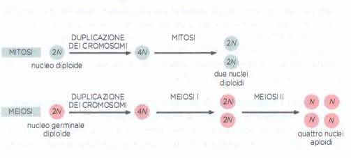 - esito ploidico: quattro cellule aploidi nella meiosi, due cellule diploidi nella mitosi;