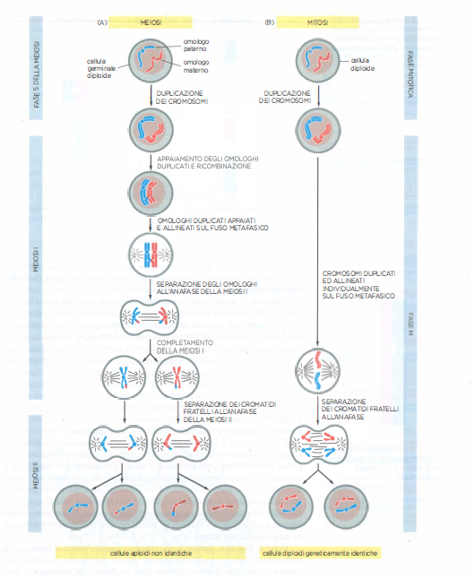 - funzione biologica: generazione di diversità genetica e produzione di gameti nella meiosi, crescita e rinnovamento tissutale nella mitosi.