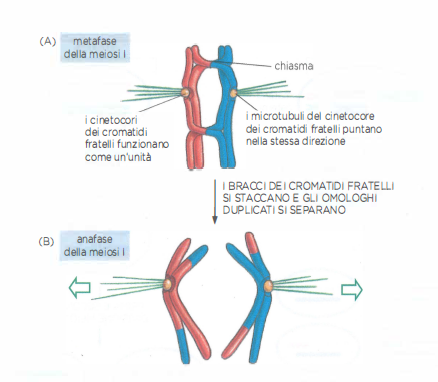 Il legame tra gli omologhi deriva da due contributi complementari: i chiasmi, che collegano cromatidi non fratelli, e le proteine coesine che tengono appaiati i cromatidi fratelli lungo i bracci dei cromosomi fino alla meiosi I (Figura 07.12-06). All’inizio dell’anafase I, l’attivazione della separasi determina la rimozione selettiva delle coesine lungo i bracci, permettendo il disancoraggio dei chiasmi e la separazione degli omologhi verso poli opposti (Figura 07.12-09). La coesione centromerica, invece, è protetta fino alla meiosi II da specifici fattori, così che i cromatidi fratelli rimangano congiunti e si orientino congiuntamente verso lo stesso polo nella prima divisione, per poi segregare tra loro nella seconda: